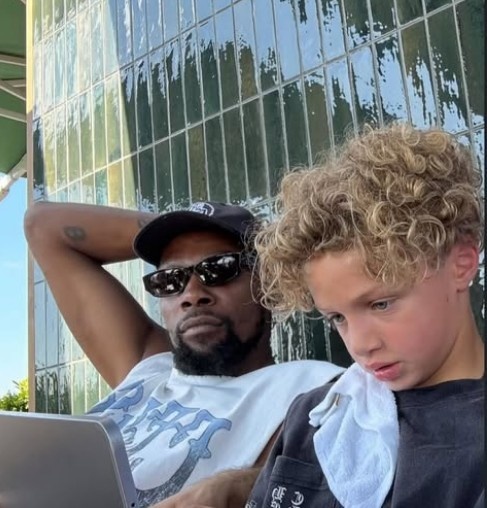 8月20日,美媒Courtside Buzz在社交媒体分享了一组温馨画面:知名歌手Drake的7岁儿子与NBA球星凯文-杜兰特并肩而坐,专注操作平板电脑。照片中的杜兰特戴着墨镜,展现出酷劲十足的个人风格。